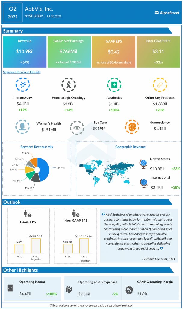 AbbVie (NYSE: ABBV) today reported its second-quarter financial results for the period ended June 30, 2021. Net revenues increased 34% to $13.9 billion. Net income for the first quarter was $766 million, or $0.42 per share, compared to the net loss of $738 million, or $0.46 per share in the second quarter of 2020