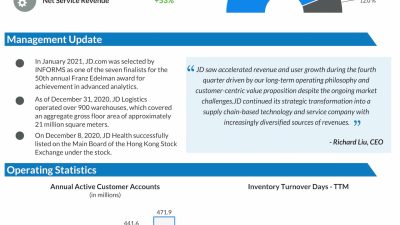 JD.com Inc. (NASDAQ: JD) reported fourth-quarter 2020 earnings results today. Net revenues increased 31.4% year-over-year to RMB224.3 billion, or $34.4 billion. Net income attributable to…