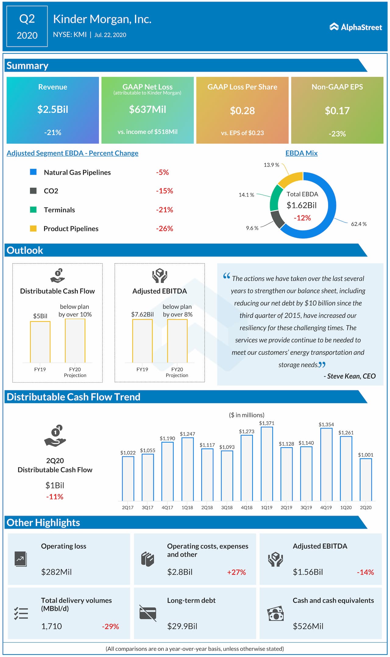 Kinder Morgan recently announced its second-quarter earnings and reported adjusted EBITDA of $1.56 billion, down 13.7% year-over-year. Comparatively, its distributable cash flow per share fell 12% to $0.44.