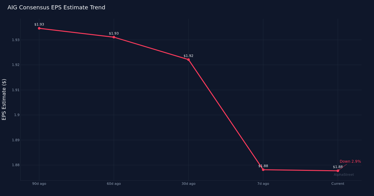 Downward Drift in Estimates. Analyst sentiment has deteriorated in recent months, with the EPS consensus declining 2.1% over the past 30 days from $1.92 and down 2.6% over the past 90 days from $1.93. This gradual erosion in expectations suggests analysts have grown more cautious, potentially reflecting concerns about underwriting conditions, investment yields, or competitive pressures in AIG’s core insurance markets. The steady downward revision pattern typically signals that Street confidence has waned as the quarter has progressed, making the bar for a positive surprise modestly lower than it stood earlier this year.