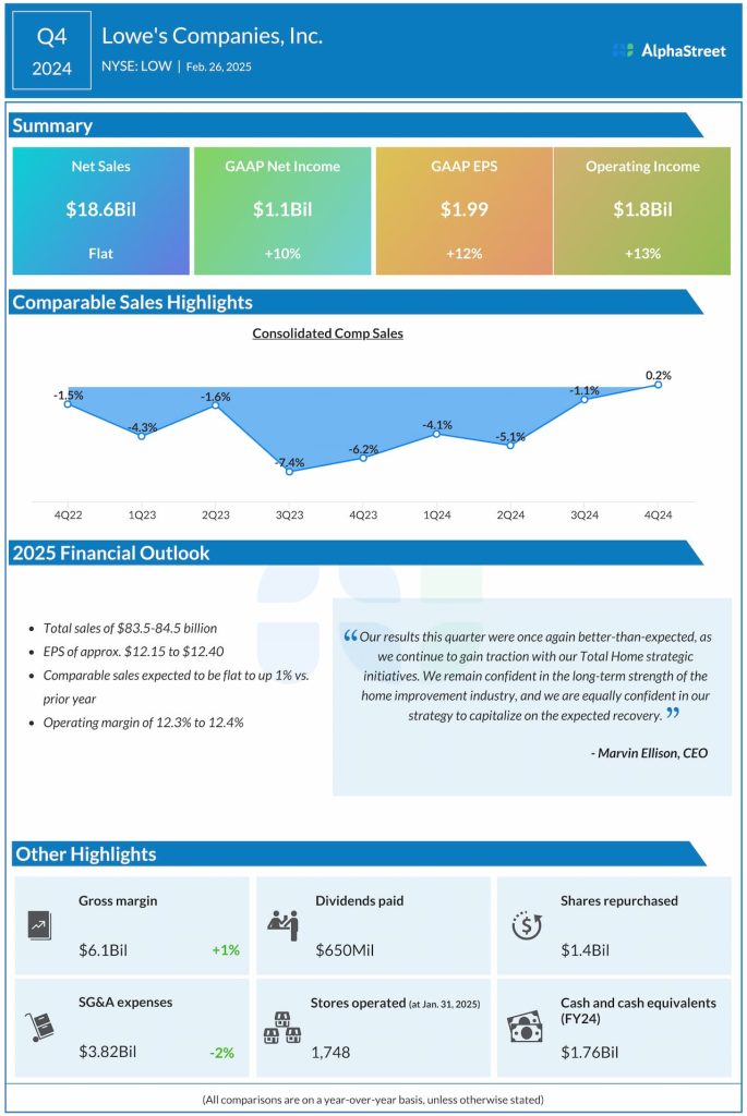 Lowe’s expects total sales of $83.5-84.5 billion for fiscal year 2025. Comparable sales are expected to be flat to up 1% compared to the previous year. EPS is expected to be approx. $12.15-12.40 for the year.