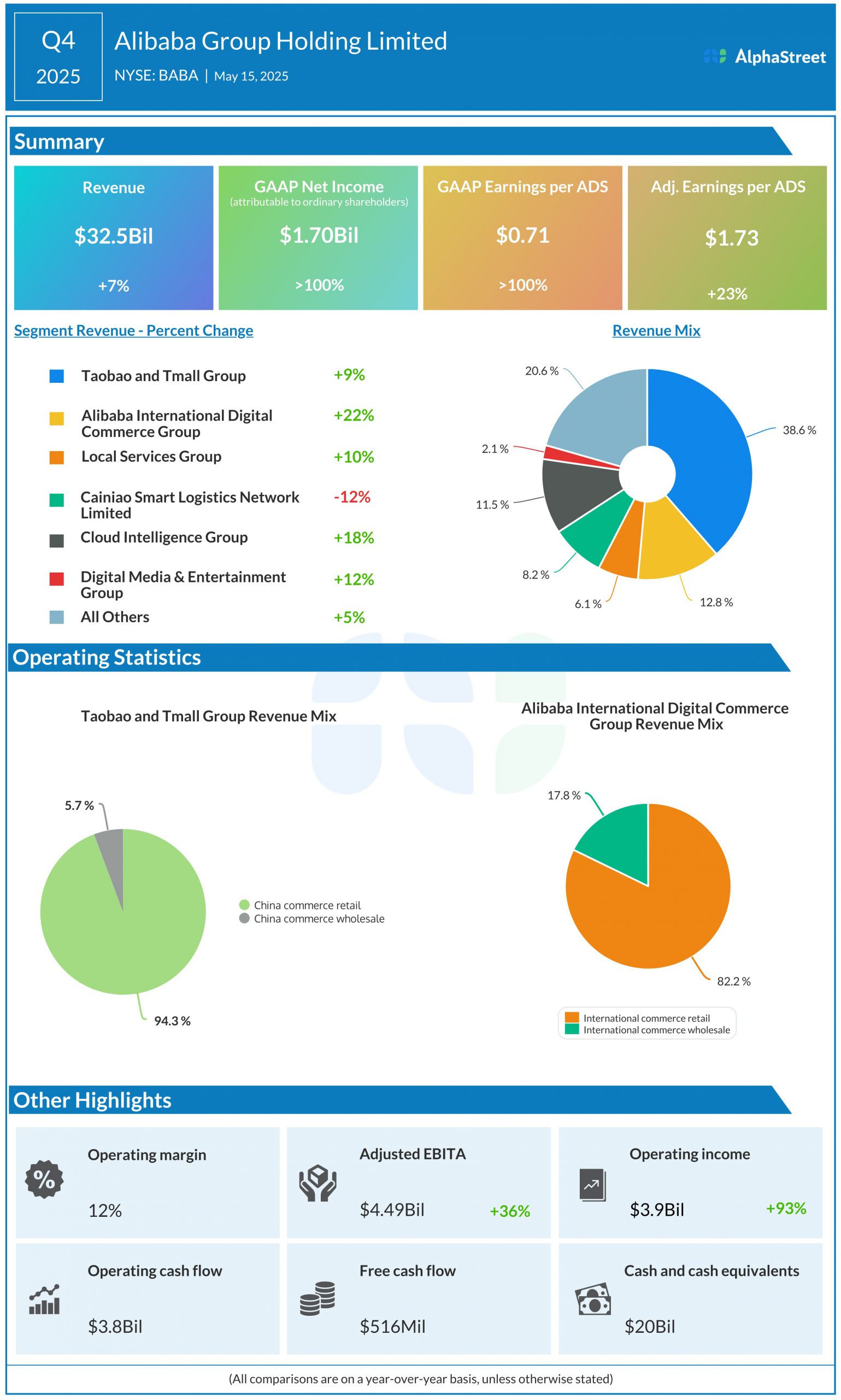 In Q4, revenue in the Taobao and Tmall Group segment increased 9% YoY to $13.9 billion. Within this segment, revenues from the China commerce retail business rose 8%, helped by a 12% increase in customer management revenue which was fueled by improved take rate. Revenue in the China commerce wholesale business increased 17%, driven by higher revenue from value-added services.