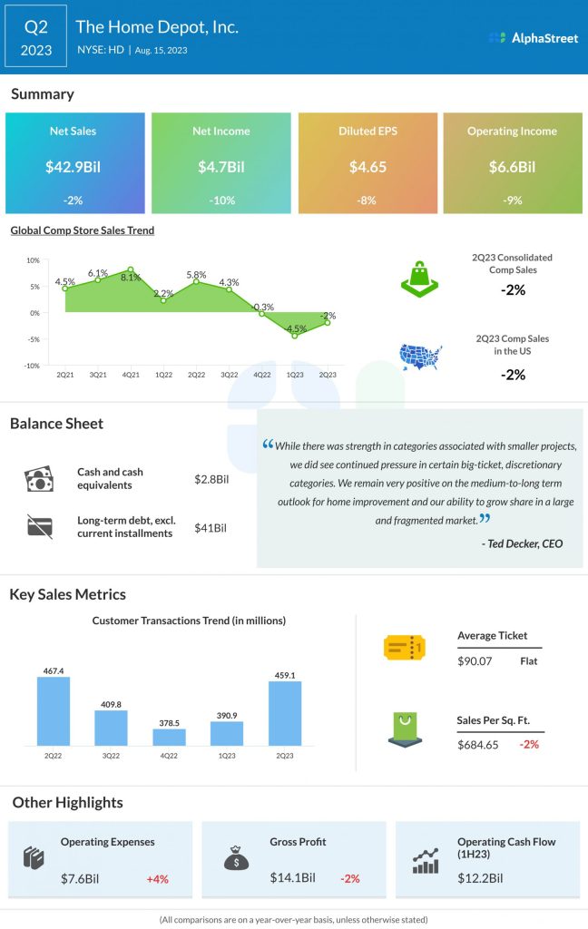 In Q2, Home Depot continued to see softness in big-ticket, discretionary categories. Overall comparable sales and comparable sales in the US were both down 2% in the quarter. Big-ticket comp transactions, or those over $1000, decreased 5.5% YoY in Q2.