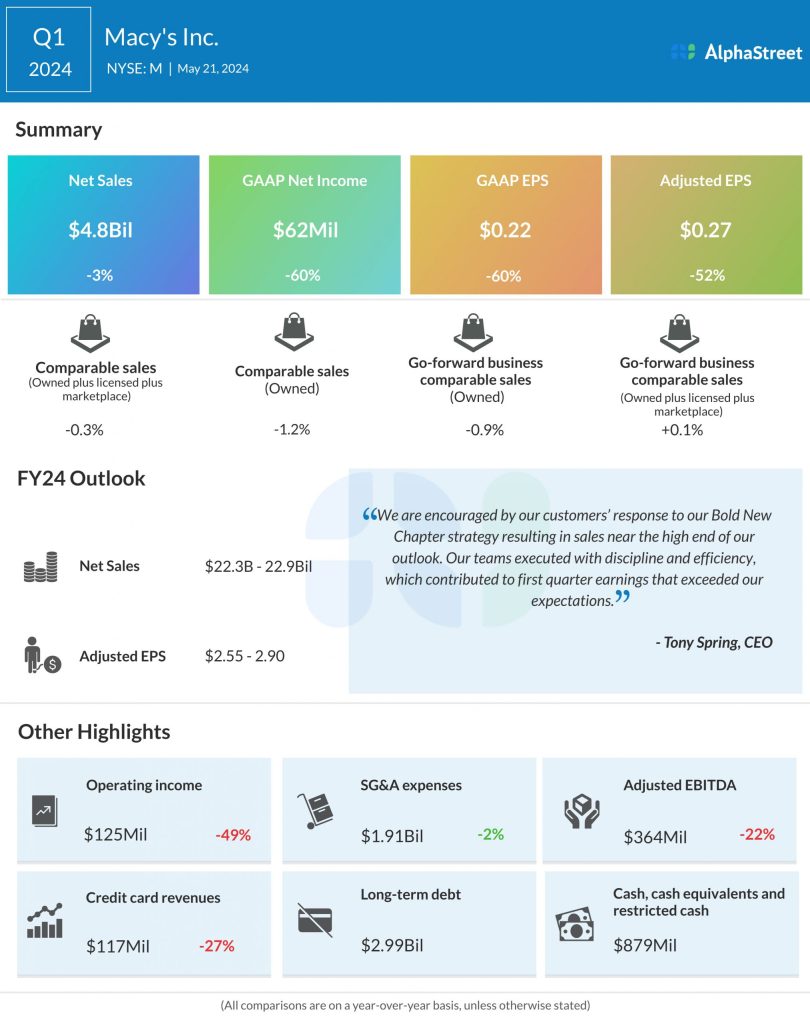 In the first quarter of 2024, Macy’s net sales decreased 2.7% year-over-year to $4.85 billion. Comparable sales were down 1.2% on an owned basis and down 0.3% on an owned-plus-licensed-plus-marketplace basis. Adjusted EPS declined 52% to $0.27.