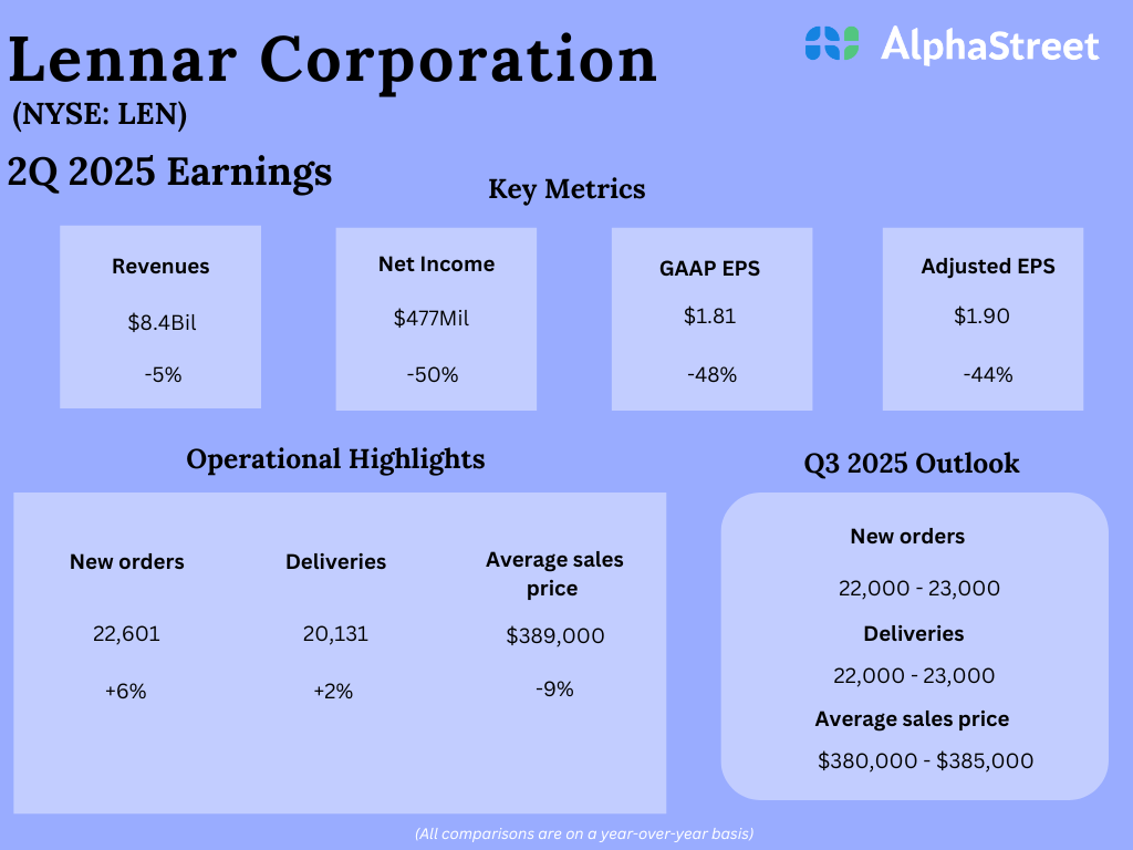 In the second quarter of 2025, Lennar’s revenues decreased 5% year-over-year to $8.4 billion. Earnings, on an adjusted basis, declined 44% to $1.90 per share compared to the prior-year period. The company saw its revenues from home sales drop 7% in the quarter mainly due to a 9% decrease in average sales price. The decrease in sales price was the result of continued weakness in the housing market, and was partly offset by an increase in home deliveries.