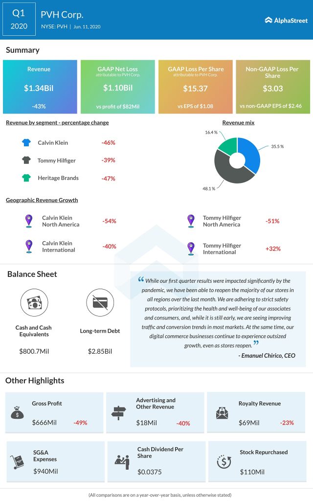On an adjusted basis, PVH reported a loss of $3.03 per share compared to a profit of $2.46 in the prior-year quarter. Revenue slumped 43% to $1.34 billion.