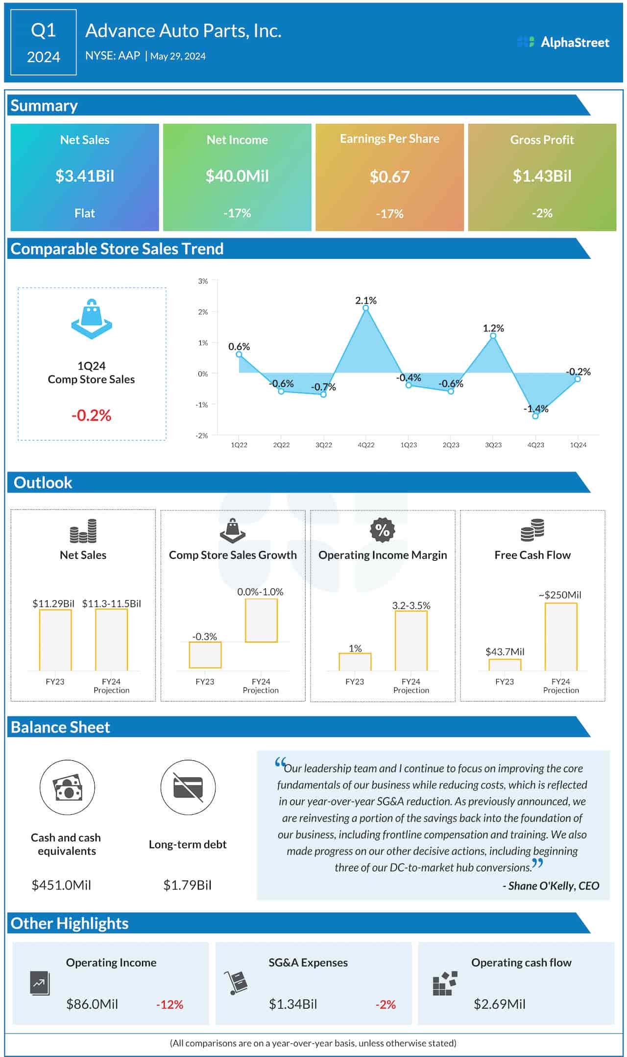 Automotive parts retailer Advance Auto Parts, Inc. (NYSE: AAP) on Wednesday reported a sharp decline in net profit for the first quarter of 2024, when sales remained broadly unchanged.