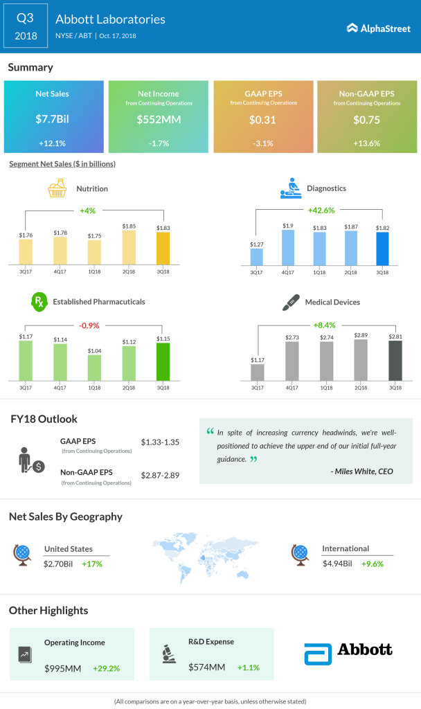 However, net income from continuing operations fell to $563 million or 31 cents per share, compared to $603 million, or 32 cents per share a year ago. On an adjusted basis, Abbott reported better-than-expected earnings of 75 cents per share, a cent higher than the street expectation.