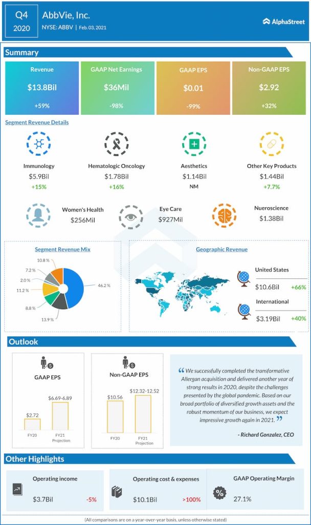 Net earnings attributable to AbbVie were $36 million, or $0.01 per share, compared to $2.8 billion, or $1.88 per share, last year. The GAAP results included a non-cash charge for Skyrizi contingent consideration revaluation based on higher estimated future sales. Adjusted EPS totaled $2.92.