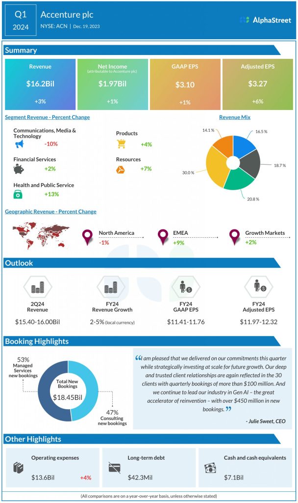 Net income attributable to Accenture plc was $1.97 billion, or $3.10 per share, compared to $1.96 billion, or $3.08 per share, last year. Adjusted EPS was $3.27, up 6% year-over-year.
