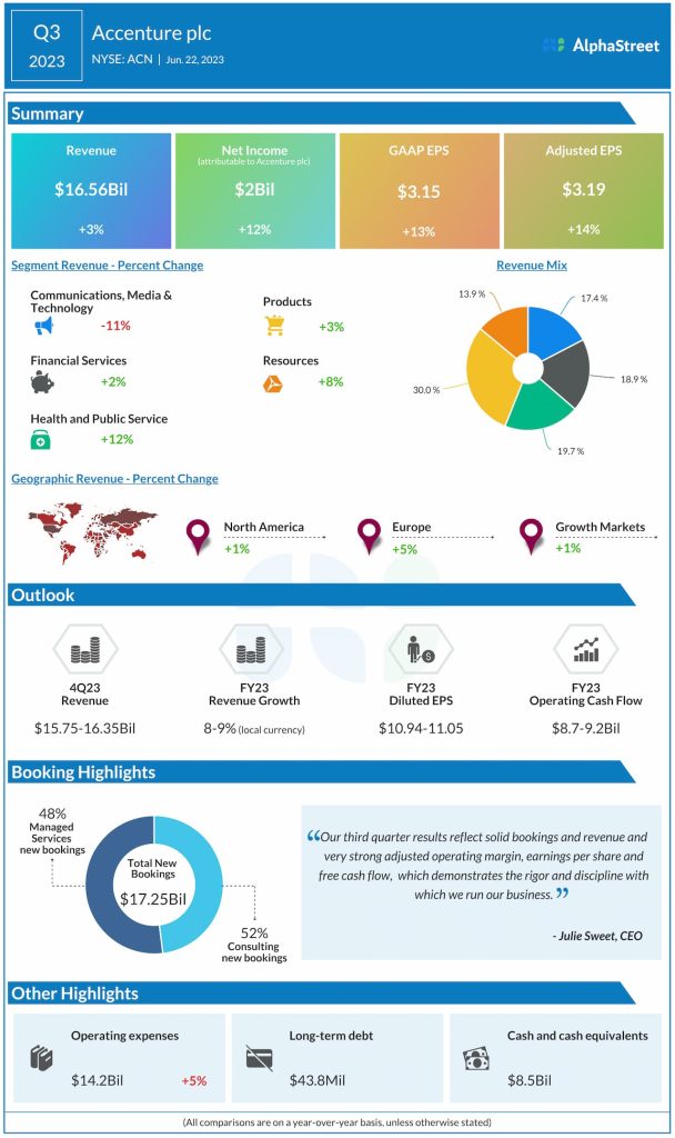 Net income attributable to Accenture plc was $2 billion, or $3.15 per share, compared to $1.78 billion, or $2.79 per share, last year. Adjusted EPS rose 14% to $3.19.