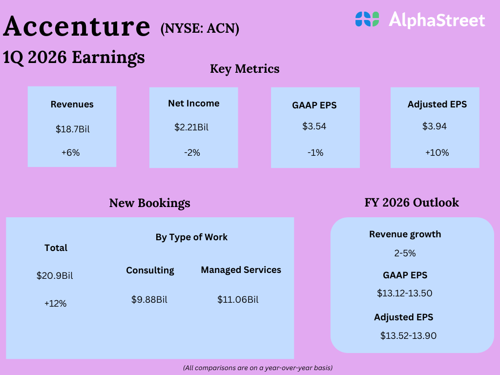 Accenture (NYSE: ACN) reported its first quarter 2026 earnings results today. Revenues of $18.7 billion increased 6% in US dollars and 5% in local currency compared to the same period a year ago. Net income attributable to Accenture plc was $2.21 billion compared to $2.27 billion last year. GAAP earnings per share was $3.54, down 1% […]