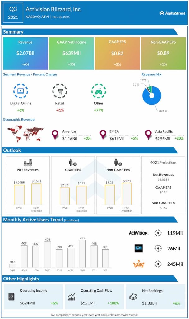 At the end of Q3 2021, Activision Blizzard had 390 million monthly active users (MAUs), which was unchanged from the same quarter a year ago and down from 408 million in Q2. MAUs in Activision rose to 119 million from 111 million last year but were down from 127 million in Q2. The segment recorded revenue of $641 million which was down YoY.