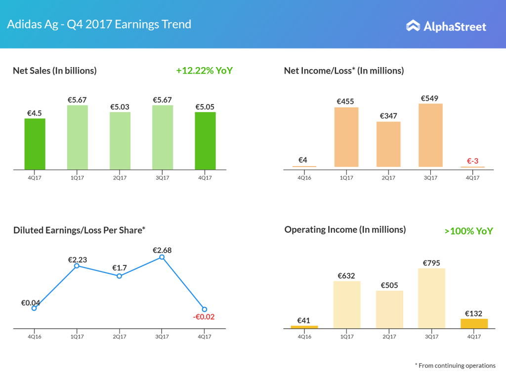 Shoemaker Adidas announced fourth quarter results today with a 12.2% spike in sales, with operating profit more than tripling for the quarter to €132 million. On the contrary, the company reported a net loss of €3 million or €0.02 per share for the quarter, hit by the US tax code change. The year-over-year sales increase was helped by North America and Greater China sales, which surged 21.3% and 24.4%, respectively.