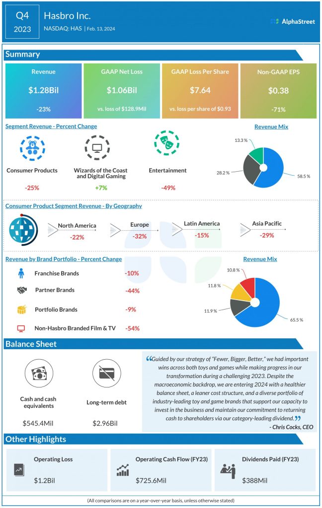 The decline in Consumer Products revenue was caused by planned business exits, broader category declines, and a step-up in inventory clearance. The segment saw revenues fall across all its geographies as well during the quarter. Hasbro also recorded revenue declines across its brand portfolio during the fourth quarter.