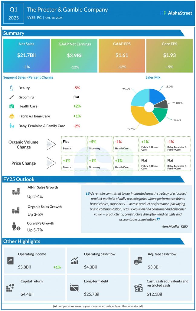 In the first three months of fiscal 2025, P&G’s net sales edged down to $21.7 billion from $21.9 billion in the prior-year quarter. Organic sales, which excludes the impacts of foreign exchange and acquisitions and divestitures, increased 2% year-over-year. The top-line fell short of analysts’ expectations, marking the fourth straight miss.