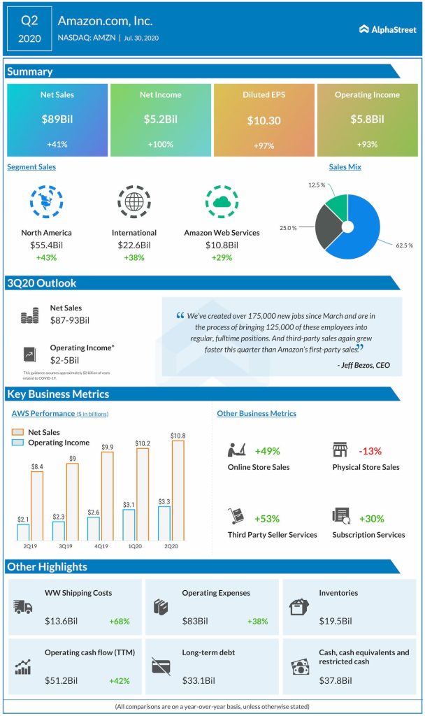Earnings per share more than doubled to a whopping $10.3 and exceeded estimates in the June quarter, after revenues grew in double digits both in North America and the international market. Catalyzed by another decent performance by Amazon Web Services (AWS), the top-line surged to $89 billion and beat the Street view.