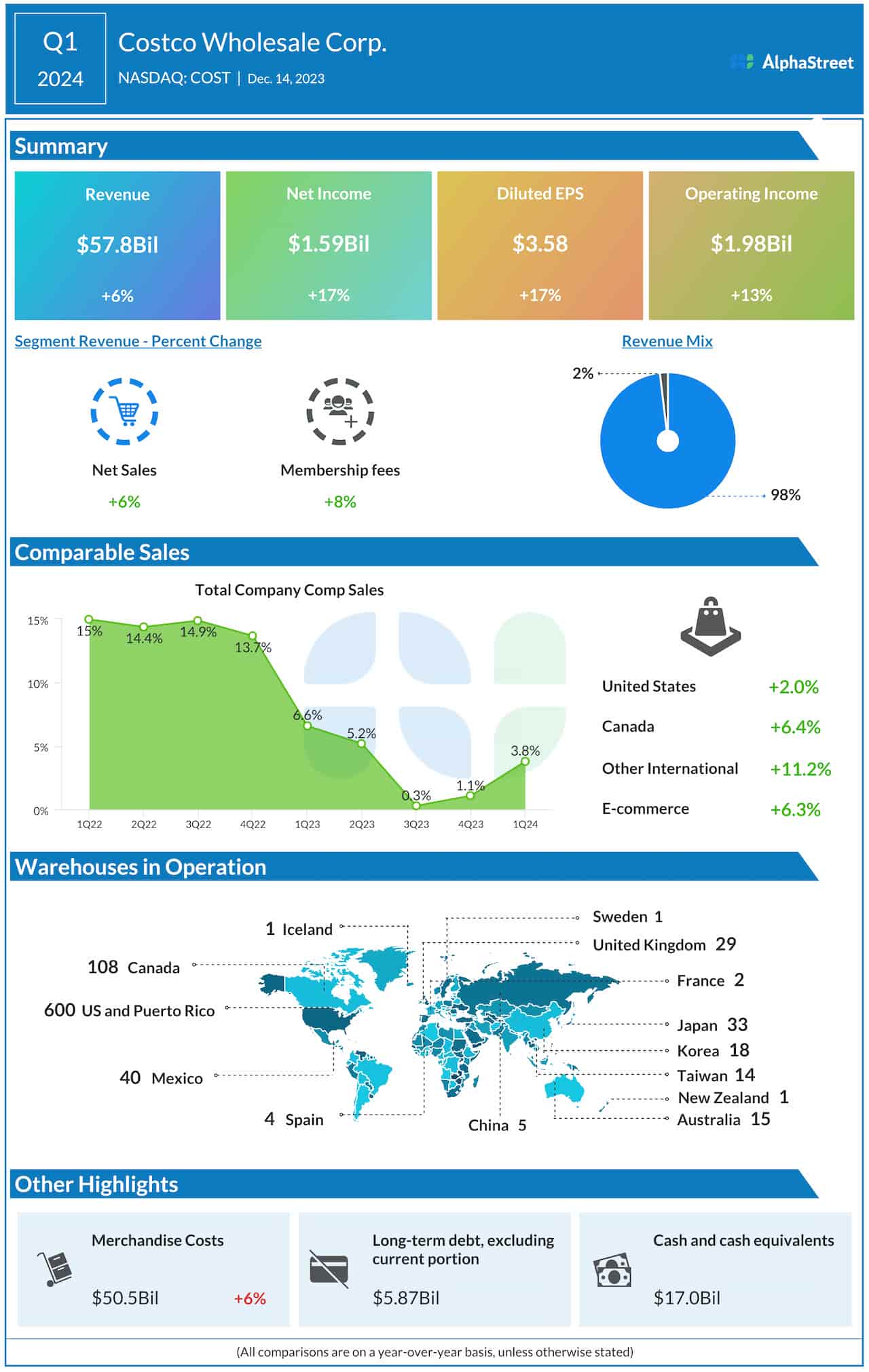 Costco’s CFO Richard Galanti said at the Q1 earnings call, “For Q2 fiscal ’24, we plan four new locations, including our sixth building in China early in the calendar year. Regarding capital expenditures, the first-quarter capital expenditure spend was approximately 1.04 billion. We estimate that fiscal ’24 capex will be in the $4.4 billion to $4.6 billion range. That’s up from 4.3 billion we had in fiscal ’23, reflecting a continued increase in the number of the expansion that we’re doing.”