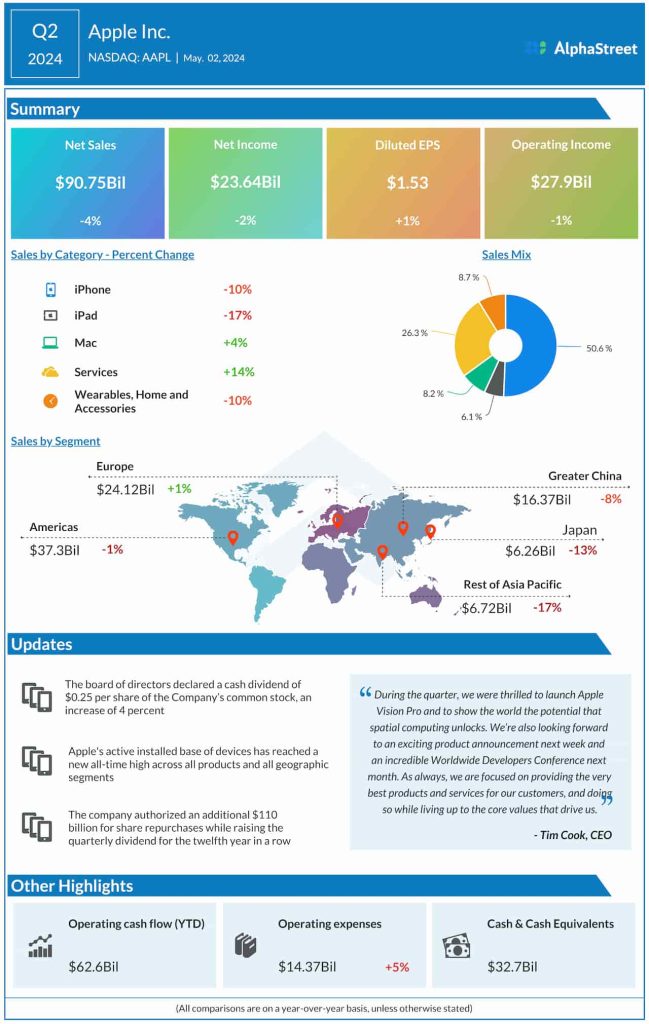The tech titan authorized an impressive share repurchase of $110 billion, sharply higher than the buyback announced last year. Revenues totaled $90.8 billion in the March quarter, down 4% compared to $94.84 billion in the same period of 2023. Sales declined across all geographical segments except Europe but came in slightly above analysts’ estimates. Q2 profit was $23.64 billion or $1.53 per share, compared to $24.16 billion or $1.52 per share in the year-ago period. Earnings exceeded Wall Street’s estimates, marking the fifth quarterly beat in a row.