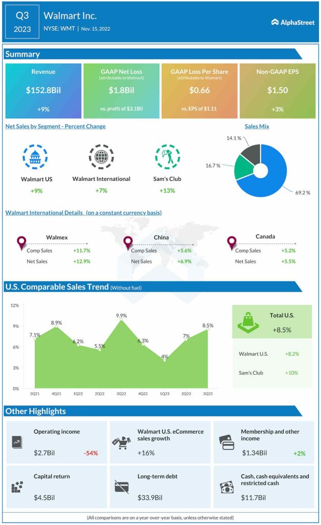 “We significantly improved our inventory position in Q3, and we’ll continue to make progress as we end the year. From The Big Billion Days in India, through our Deals for Days events in the U.S. and a Thanksgiving meal that will cost the same as last year, we’re here to help make this an affordable and special time for families around the world. We have an amazing group of associates that make all this happen, and I want to say thank you,” said Doug McMillon, president and chief executive officer of Walmart.
