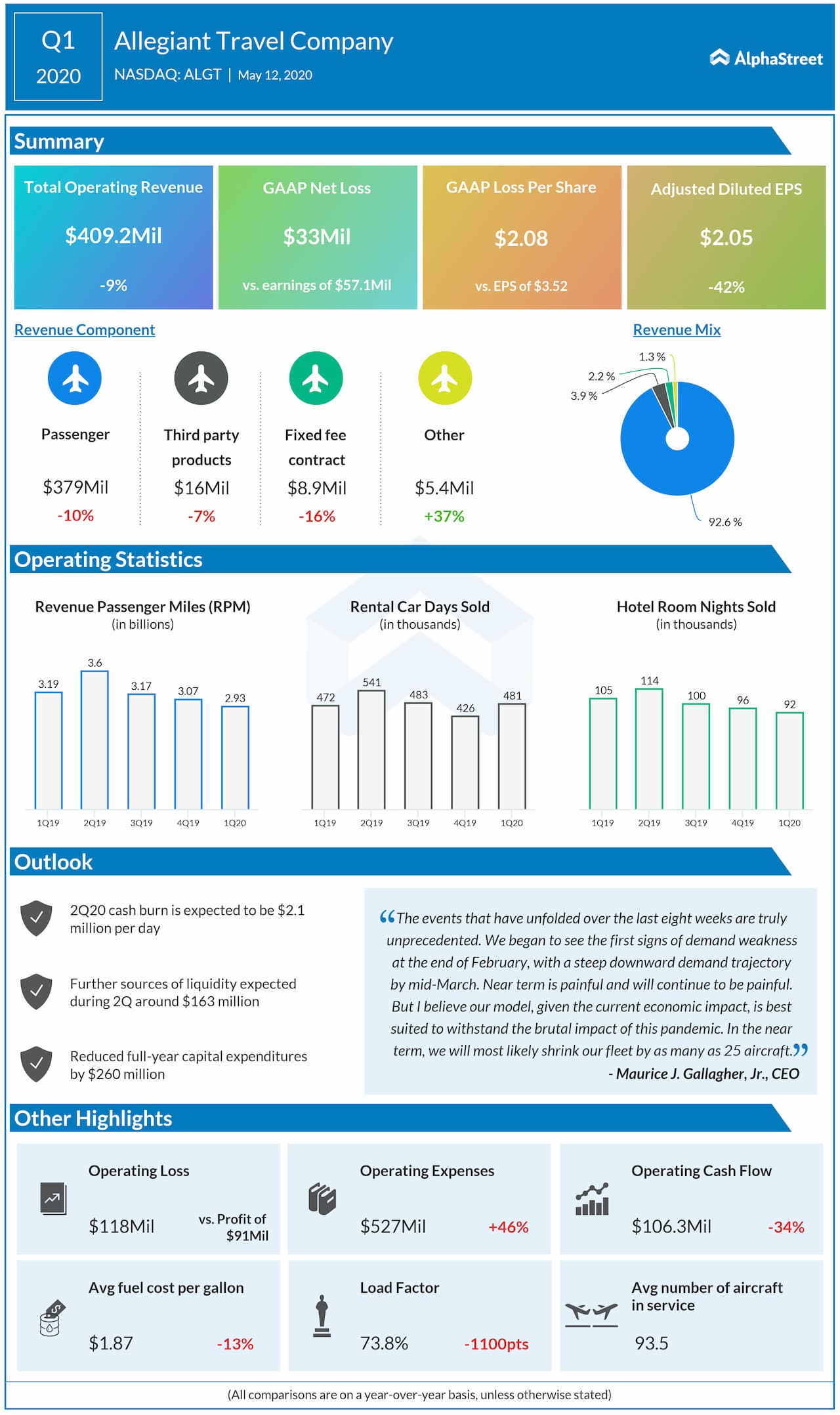 Allegiant Travel Company (NASDAQ: ALGT) reported its financial results for the quarter ended March 31, 2020, on Tuesday after the market closes. The company suspended all stock buybacks and dividends while executives reduced salaries by 50% and board members are foregoing cash compensation.