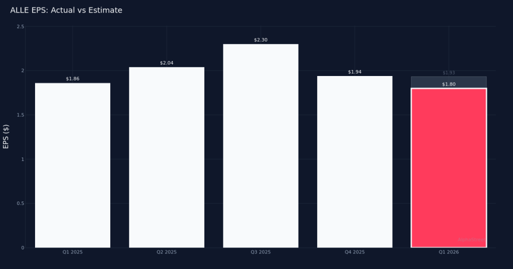 Allegion plc (ALLE) posted Q1 2026 adjusted EPS of $1.80, falling short of the $1.93 estimate (miss by 6.7%).