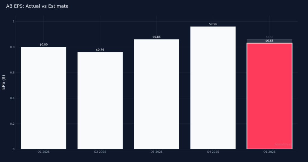 Q1 2026 adjusted earnings at AllianceBernstein Holding L.P. (AB) came in at $0.83 per share, trailing the $0.86 consensus (miss by 3.5%).