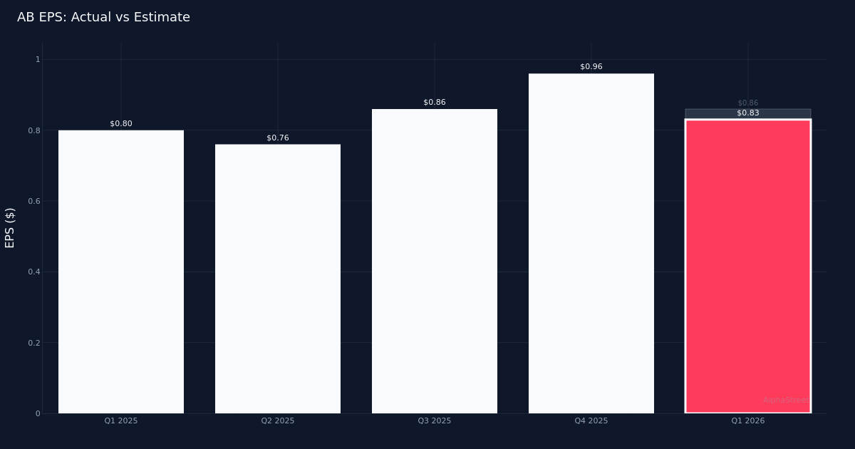 Q1 2026 adjusted earnings at AllianceBernstein Holding L.P. (AB) came in at $0.83 per share, trailing the $0.86 consensus (miss by 3.5%). Revenue totaled $1.20B for the quarter. Revenue was up 11.2% year-over-year.