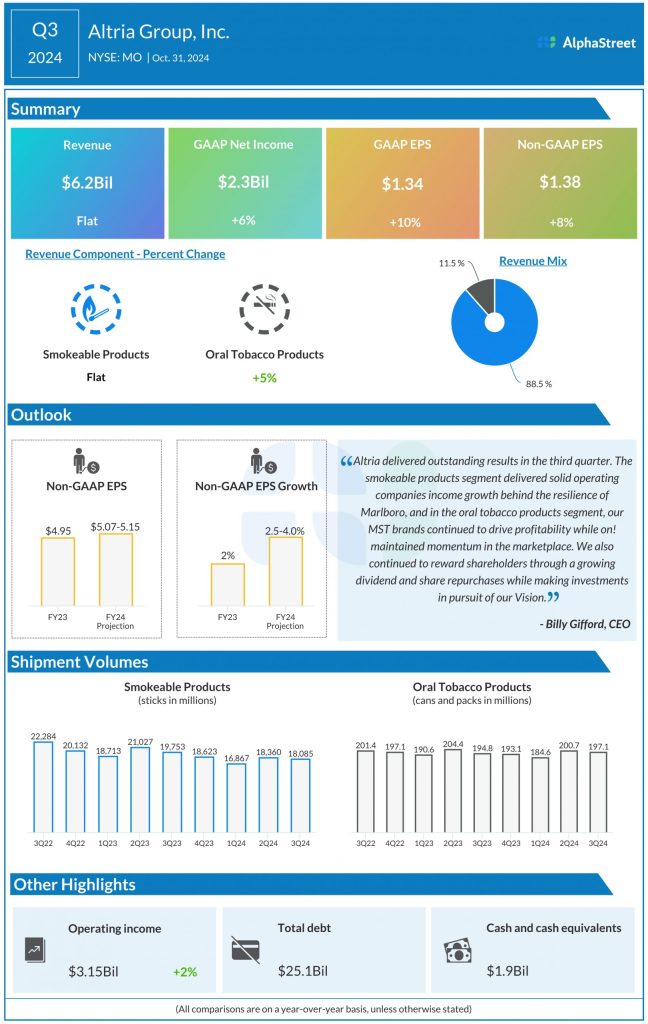 Shares of Altria Group, Inc. (NYSE: MO) remained green on Monday. The stock has gained 9% over the past three months. MO saw overall revenue dip slightly during its most recent quarter, due to lower revenues from smokeable products, while earnings saw strong growth, supported by higher operating companies income (OCI). The company continues to make progress in its smoke-free business even as it faces challenges within the smokeable products division. Here are a few points of note: