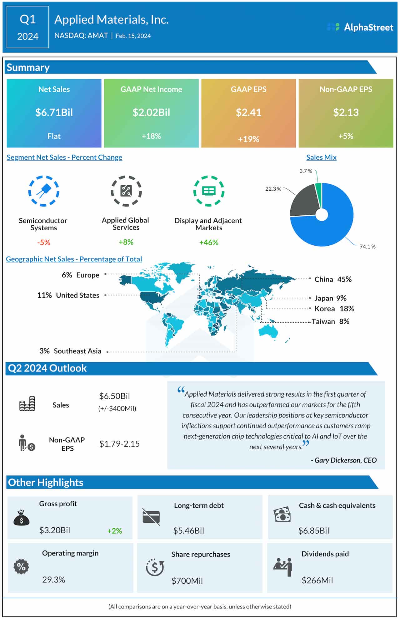 “Our leadership positions at key semiconductor inflections support continued outperformance as customers ramp next-generation chip technologies critical to AI and IoT over the next several years,” said Gary Dickerson, the company’s CEO.