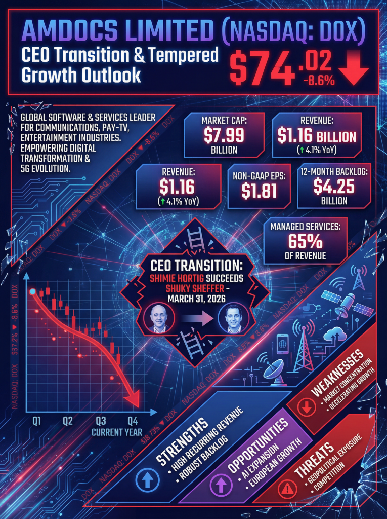 - Valuation: Amdocs carries a trailing price-to-earnings (P/E) ratio of 14.66. Its forward P/E is estimated at 9.83, reflecting a conservative valuation relative to the broader IT services sector as investors weigh a moderated growth outlook.