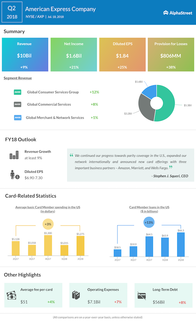 American Express expects revenues to be up at least 9% for 2018. The company reaffirmed its EPS guidance at the high end of the $6.90 to $7.30 range for the full year.