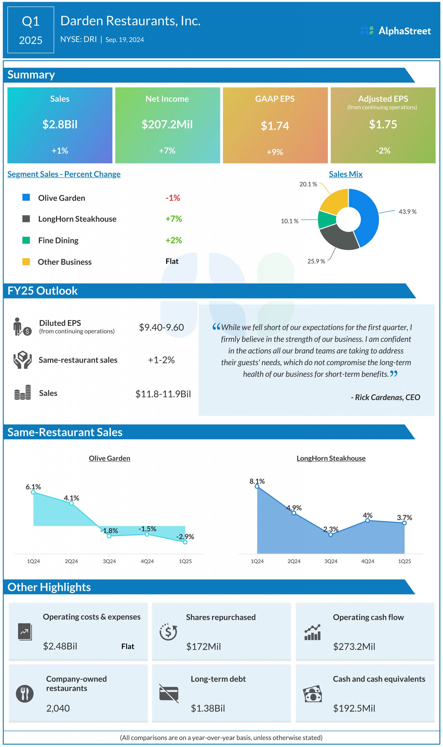 Darden Restaurants, Inc., (NYSE: DRI) reported its first quarter 2025 earnings results today. Total sales increased 1% to $2.8 billion…