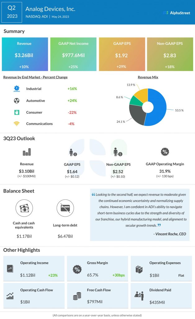 “Looking to the second half, we expect revenue to moderate given the continued economic uncertainty and normalizing supply chains. However, I am confident in ADI’s ability to navigate short-term business cycles due to the strength and diversity of our franchise, our hybrid manufacturing model, and alignment to secular growth trends,” said Analog’s chief executive officer Vincent Roche.