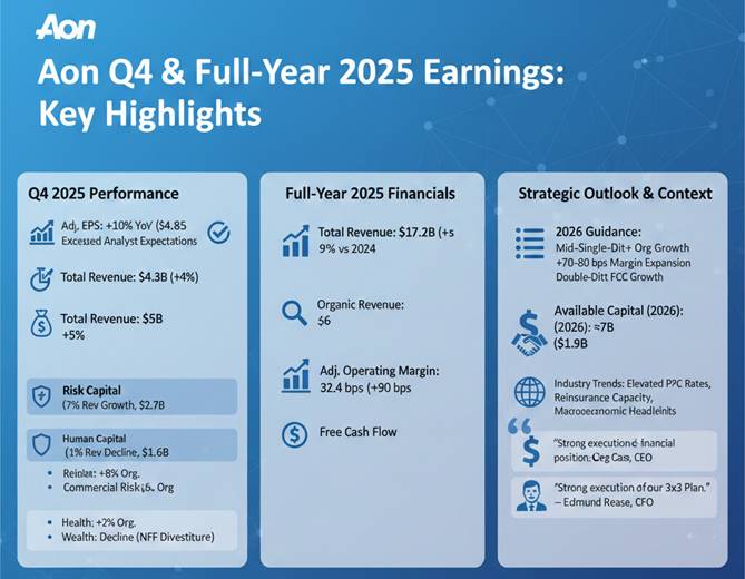 Aon plc (NYSE: AON) on Friday reported fourth-quarter financial results that exceeded analyst earnings expectations, driven by robust performance in its reinsurance and commercial risk segments. The professional services firm saw its adjusted earnings per share rise 10% year-over-year, supported by significant expansion in operating margins, even as total revenue growth was moderated by the impact of recent divestitures. Following the announcement, Aon shares edged higher in early trading, as investors weighed the earnings beat against a slight miss on top-line estimates.