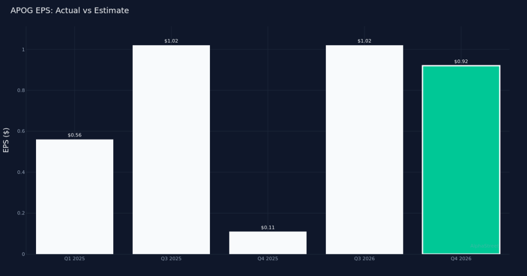 Management set guidance for fiscal year 2027 with expected adjusted earnings per share ranging from $2.70 to $3.25 on revenue between $1.38B and $1.43B. The outlook comes as Apogee navigates evolving construction cycles and project timing dynamics. Wall Street maintains a constructive view on the shares, with consensus standing at 5 buy ratings, 1 hold, and 0 sell.