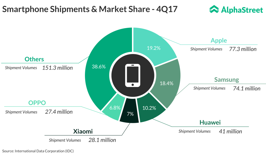 Meanwhile, an IDC report that arrived a few weeks earlier said iPhone shipment volumes grew 19.2% in the fourth quarter, higher than all its competitors. This, complemented by iPhone’s premium pricing, helps the company reach deep into consumer wallets.