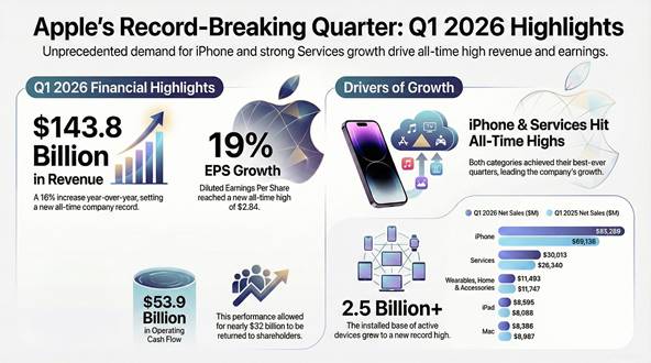 For the quarter ended December 27, 2025, Apple posted revenue of $143.8 billion, representing a 16% increase compared to the same period a year ago. Diluted earnings per share (EPS) reached an all-time high of $2.84, a 19% year-over-year jump that outperformed the consensus analyst forecast of $2.67.