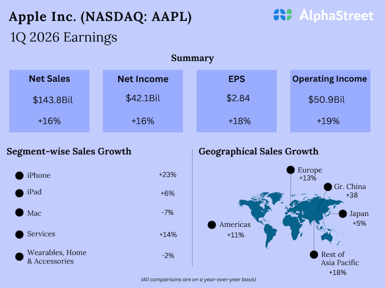 The tech giant’s net sales for the first quarter rose to $143.8 billion from $124.3 billion in the comparable quarter of fiscal 2025, exceeding consensus estimates. Sales of iPhone increased 23% YoY during the three months.