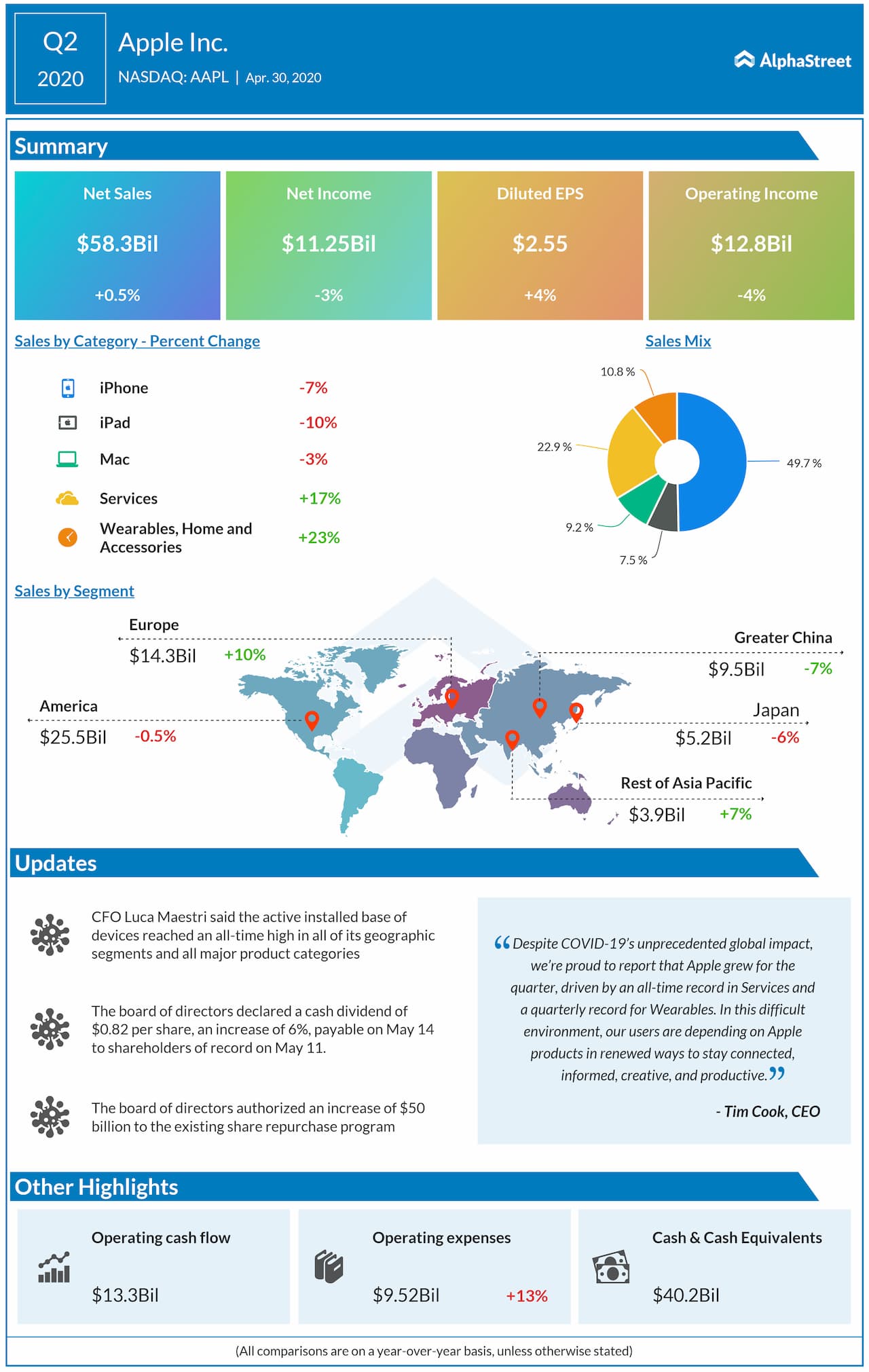 Apple’s board of directors has declared a cash dividend of $0.82 per share of its common stock, an increase of 6%. The dividend is payable on May 14, 2020, to shareholders of record as of the close of business on May 11, 2020. The board has also authorized an increase of $50 billion to the existing share repurchase program.