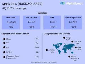 In the first quarter, the company generated revenues of $124.3 billion, compared to $119.58 billion in the same period of 2024. There was a 1% drop in iPhone sales. Q1 profit, on a per-share basis, came in at $2.40, vs. $2.18 a year earlier. Net profit was $36.3 billion, compared to $33.9 billion in the year-ago period.