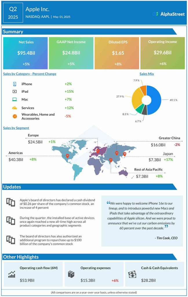 The tech firm reported net sales of $95.4 billion for the March quarter, compared to $90.75 billion in the same period of 2024. The top line exceeded estimates. There was a 1.9% increase in iPhone sales.