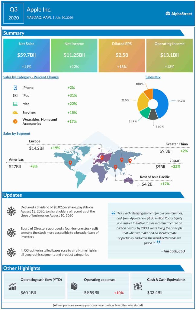 Apple reported Q3 revenue of $59.7 billion with earnings per share of $2.58. This was significantly higher than Wall Street revenue and earnings estimates of $52.25 billion and $2.04 respectively. Its EPS grew 18% while sales were up 11% year-over-year and the company generated operating cash flow of $16.3 billion.