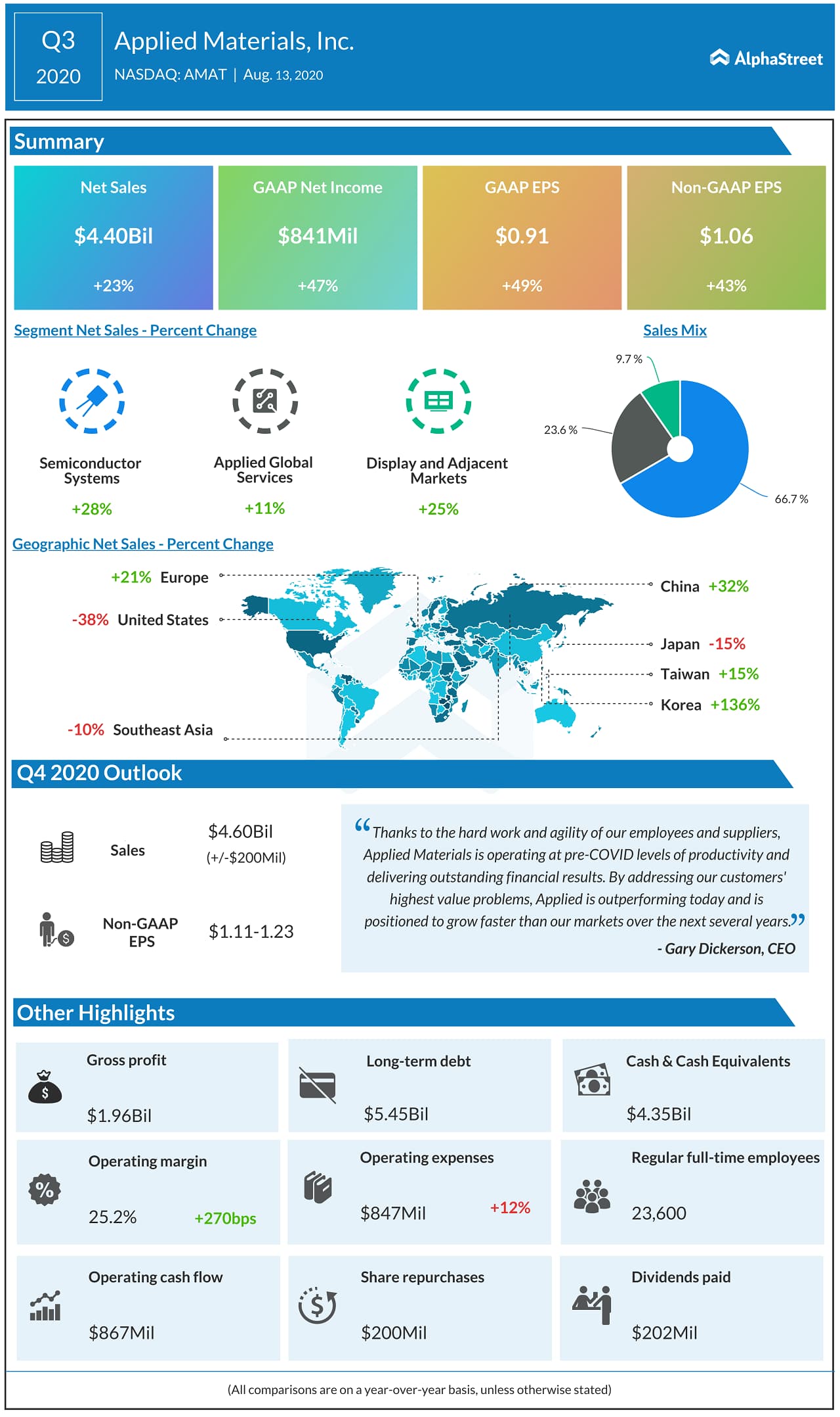 Applied Materials’ (NASDAQ: AMAT) earnings and revenue for the third quarter exceeded the market’s views. Adjusted EPS of $1.06 and revenue of $4.40 billion in Q3, grew 43% and 23%, respectively and beat the consensus targets. AMAT stock rose about 1% in the after-market hours.