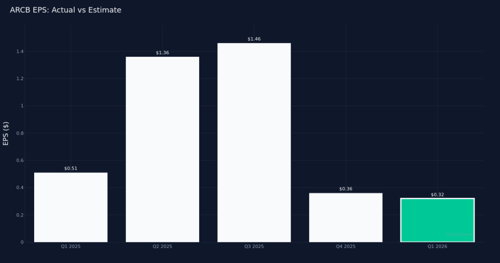 ArcBest Corporation reported first-quarter 2026 results that exceeded Wall Street expectations, with the integrated logistics company posting non-GAAP earnings of $0.32 per share, beating the $0.28 consensus estimate by 14.3%. Revenue totaled $998.8M for the quarter, up 3.1% from the $967.1M recorded in Q1 2025. Adjusted bottom-line profit came in at $7.2M for the period.