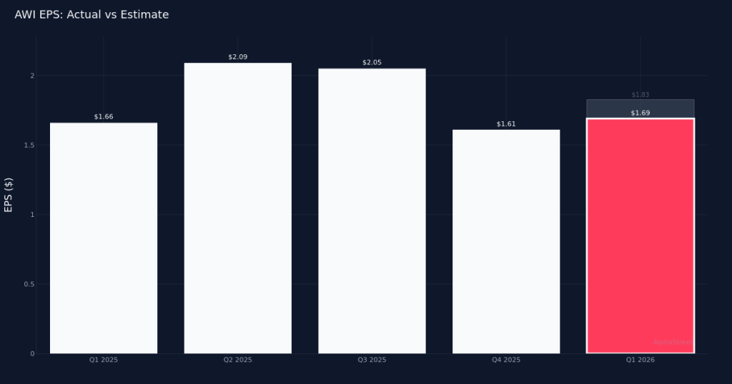 AWI|EPS $1.69 vs $1.83 est (-7.7%)|Rev $409.9M|Net Income $66.8MEarnings miss. Armstrong World Industries, Inc. (NYSE:AWI) reported Q1 2026 adjusted diluted earnings per share of $1.69, missing Wall Street’s $1.83 estimate by 7.7%. The building products manufacturer generated $409.9M in revenue for the quarter, up 7.1% from $382.7M in the prior-year period, reflecting continued demand for ceiling solutions despite the bottom-line shortfall. Adjusted net income came in at $73.0M as the company navigated persistent input cost pressures and operational investments.