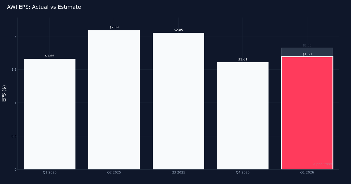 Earnings miss. Armstrong World Industries, Inc. (NYSE:AWI) reported Q1 2026 adjusted diluted earnings per share of $1.69, missing Wall Street’s $1.83 estimate by 7.7%. The building products manufacturer generated $409.9M in revenue for the quarter, up 7.1% from $382.7M in the prior-year period, reflecting continued demand for ceiling solutions despite the bottom-line shortfall. Adjusted net income came in at $73.0M as the company navigated persistent input cost pressures and operational investments.