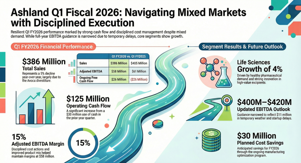 Ashland Inc. (NYSE: ASH) reported a net loss for the first quarter of fiscal 2026 and revised its full-year Adjusted EBITDA guidance downward at the top end. The company’s performance was impacted by the divestiture of its Avoca business and temporary operational hurdles, including a startup delay at its Calvert City facility. While overall sales declined 5% to $386 million, management identified signs of demand resilience in core consumer-focused segments and realized early benefits from restructuring and cost-optimization initiatives.