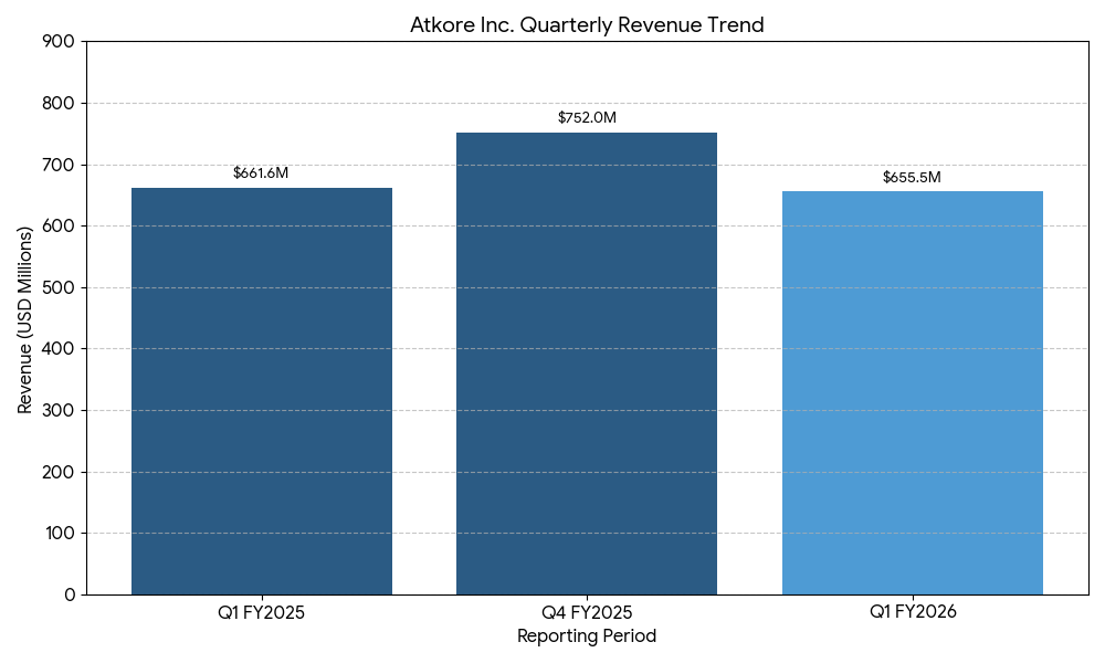 Atkore Inc (NYSE: ATKR) shares were up modestly on Tuesday after the company reported first-quarter fiscal 2026 earnings that showed a small decline in revenue and a substantial drop in net profit. At around midday trading, ATKR was changing hands near $70.38, up about 0.5% on the session. The stock has traded in a 52-week range of approximately $49.92 to $80.06. Market capitalization was about $2.36 billion.