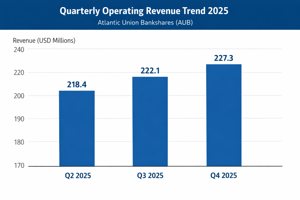 For the full year 2025, Atlantic Union Bankshares reported total revenue of $1.05 billion. Annual net profit reached $261.8 million. The data indicates a significant upward trend in scale and earning capacity following the closure and integration of the Sandy Spring transaction.